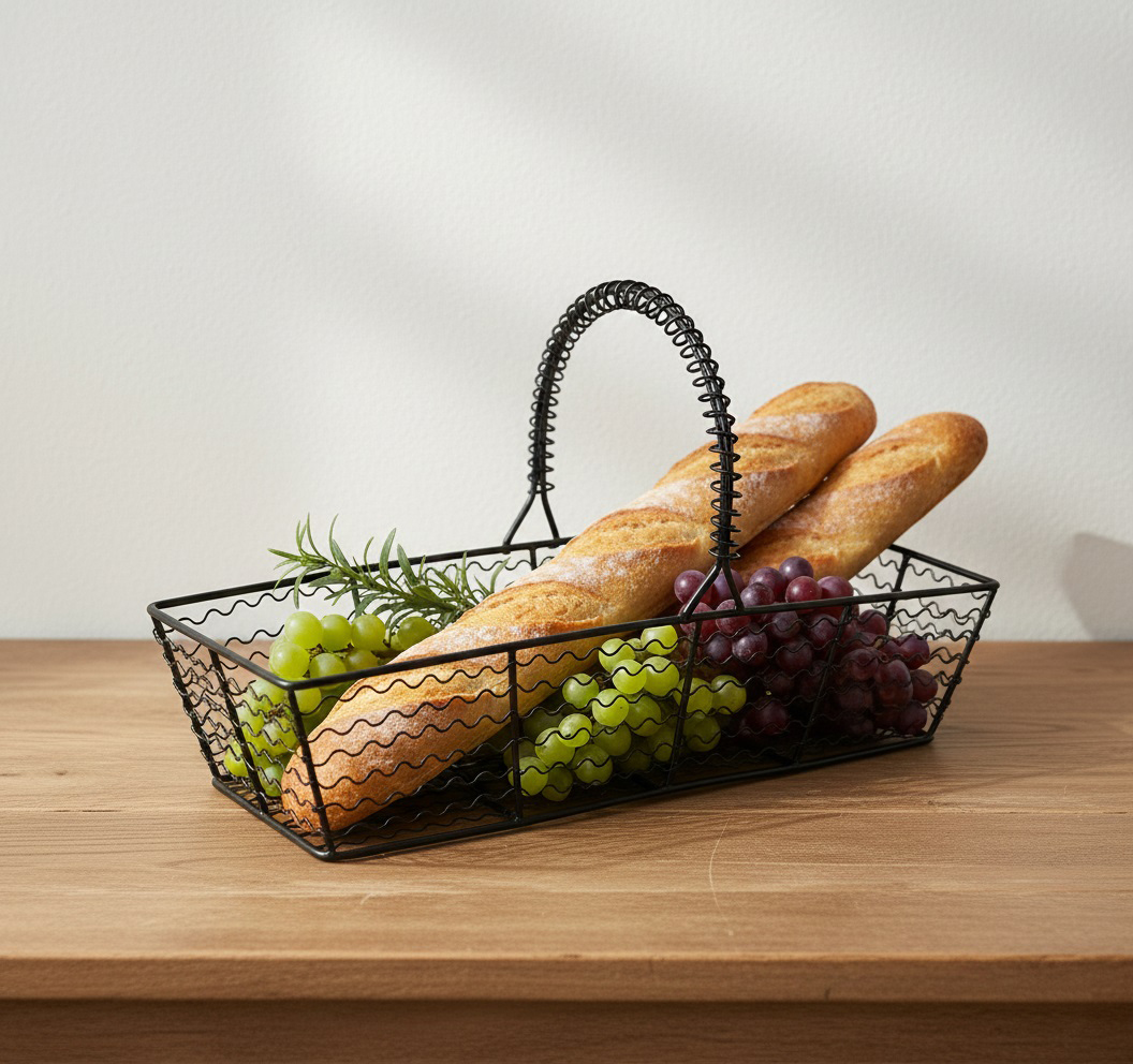 Offer your customers a blend of rustic charm and modern functionality with this unique rectangular black wire serving basket. Designed for high retail turnover, this basket features a fine, durable wire mesh construction in a classic rectangular shape, ideal for maximizing countertop space. The signature detail is the tall, coiled metal handle, providing both an elegant aesthetic and comfortable carrying functionality, making it perfect for use as a bread basket, a fruit display bowl, or a decorative centerpiece. The matte black finish is versatile and highly sought after by retailers targeting Farmhouse, Rustic, and Casual Dining markets. Available for reliable export and volume orders, this marketable piece is guaranteed to add a distinctive, high-value item to your home goods inventory.